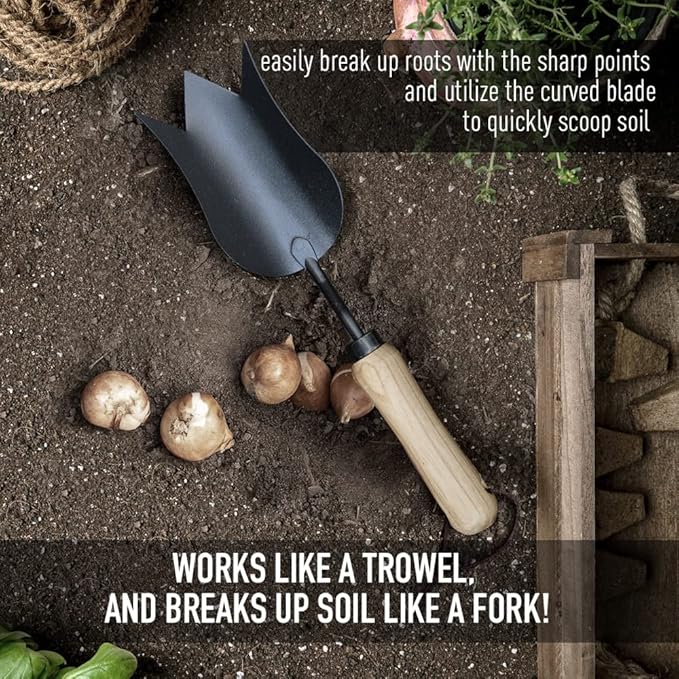 - 銆怲ULIP TROWEL銆?- Works like a trowel, and breaks up soil like a fork! An specialized take on the standard trowel, built with sharpened edges and three points. Easily break up roots with the sharp points and utilize the curved blade to quickly scoop soil.