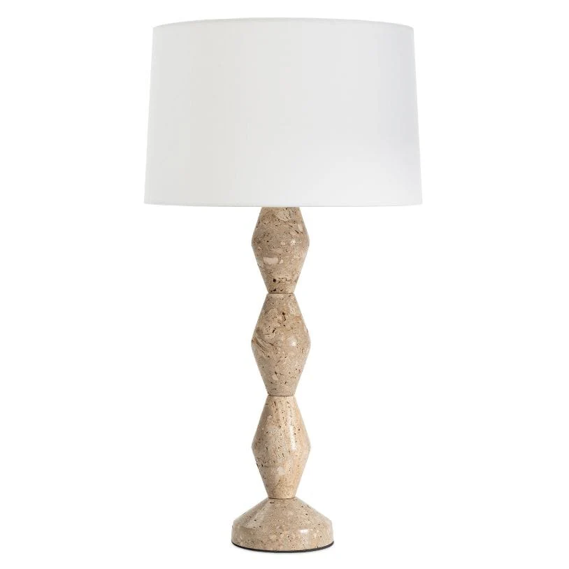 This buffet lamp collection combines geometric design with mid-century modern style, featuring bases in walnut or travertine. It provides warm, adjustable lighting with linen shades.