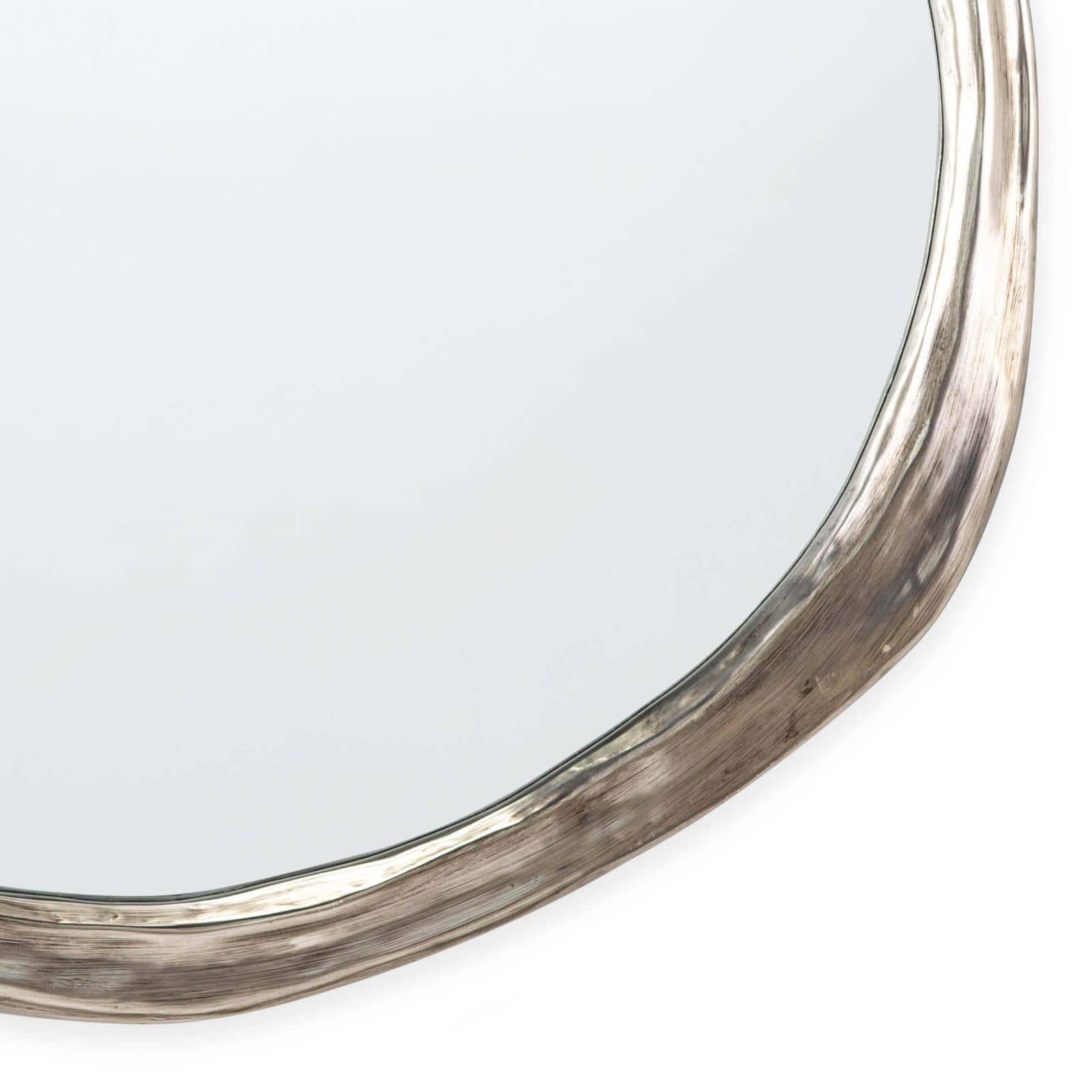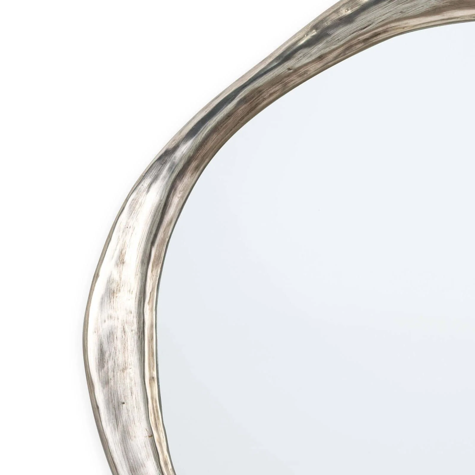 The Ibiza Mirror features an organic, hand-carved shape with a slightly undulating circular design. It has a classic antique silver finish.