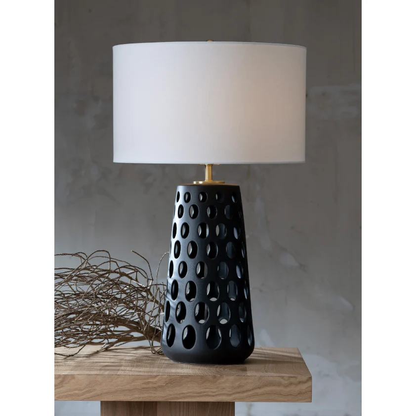 The Kelvin Ceramic Table Lamp features a perforated base that allows natural light to create a subtle effect. It has a black glaze finish, a linen shade, and brass fittings.