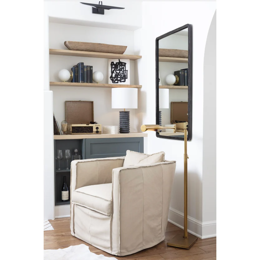 The Noir Column Lamp features a black travertine stone body with deep grooves and a natural linen shade. It adds a sophisticated touch to any room.