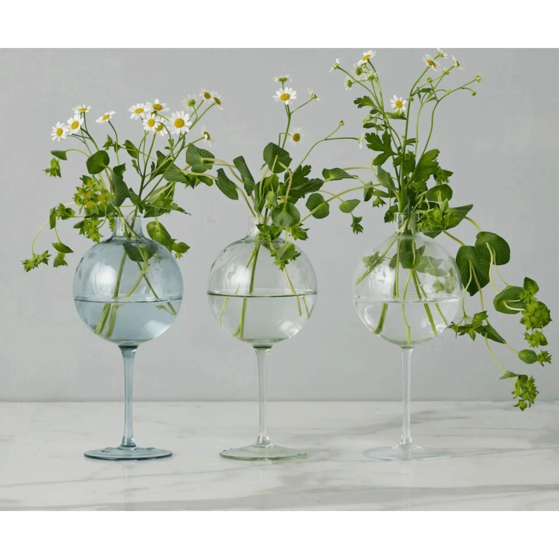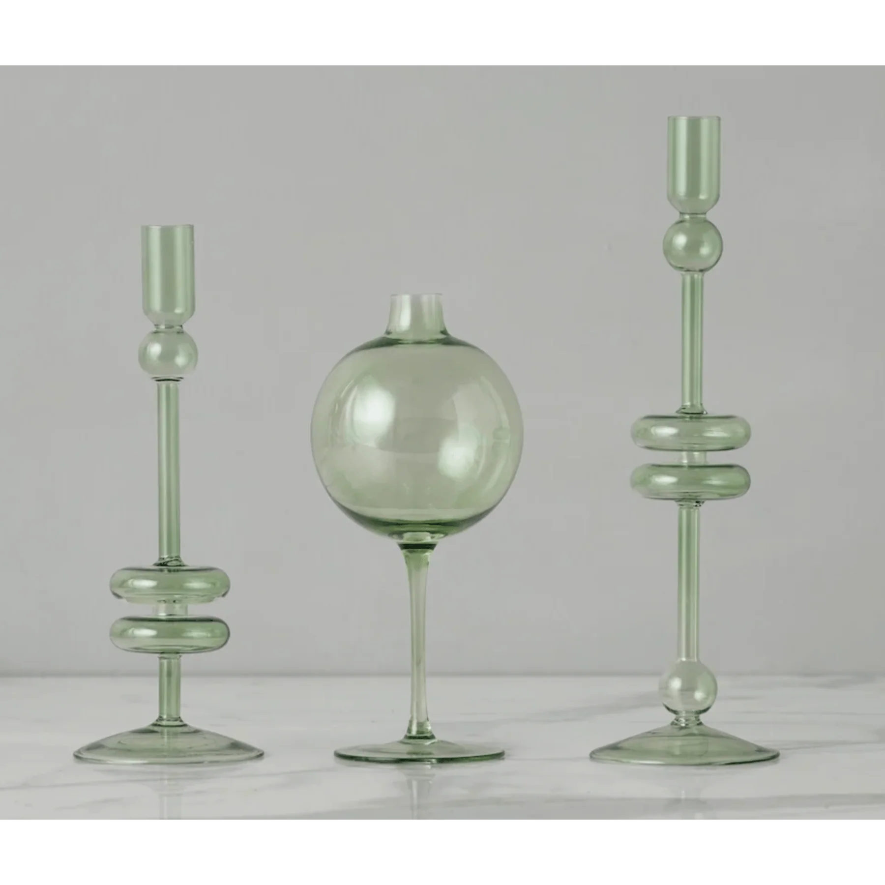 The Sage Green Wine Glass Vase combines a unique design with elegant charm. It features a glass sphere atop a wine glass stem, making it a distinctive decorative piece.