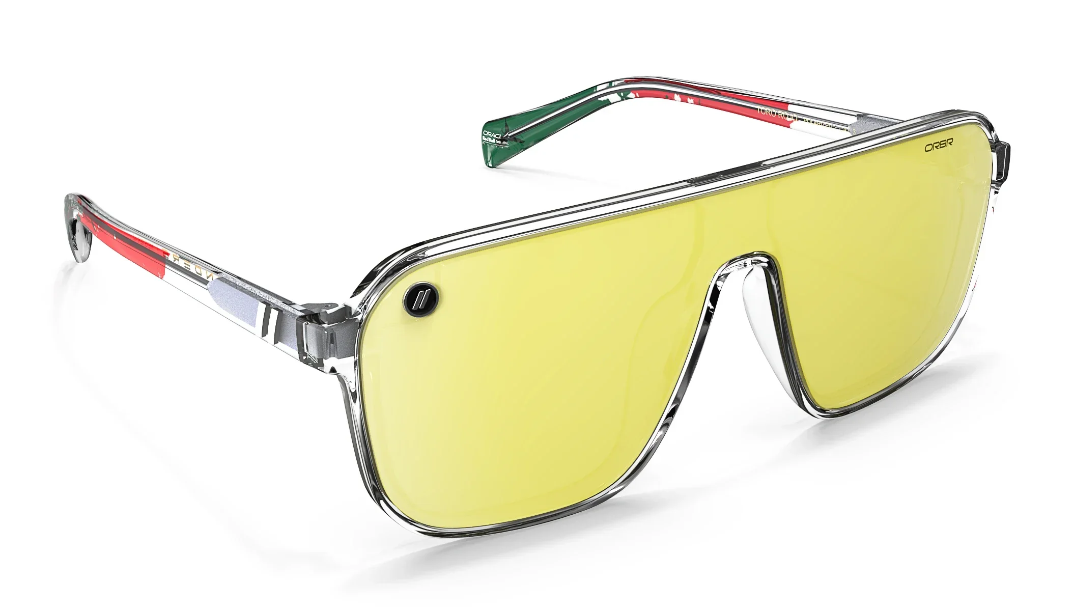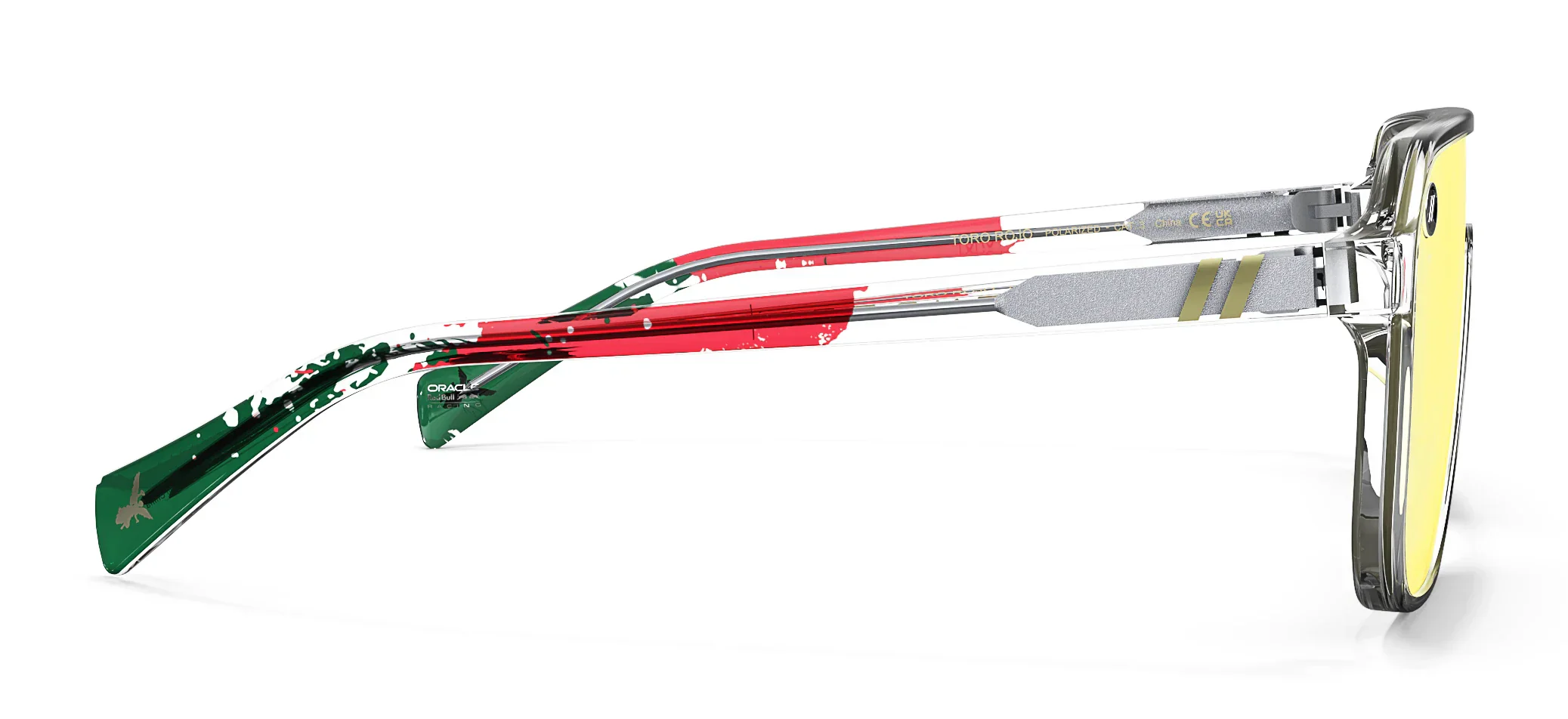 The Oracle Red Bull Racing Collection ‘Toro Rojo’ shades are a limited-edition tribute to the speed, style, and tradition of the Mexico City Grand Prix. We鈥檝e splashed the crystal-clear temples with red and green in a proud nod to the Mexican flag and detailed each tip with the silhouette of the famed El 脕ngel de la Independencia monument. Our polarized, scratch-resistant PureBlend鈩?Lens 鈥?present in shimmering gold 鈥?takes the checkered flag. //
