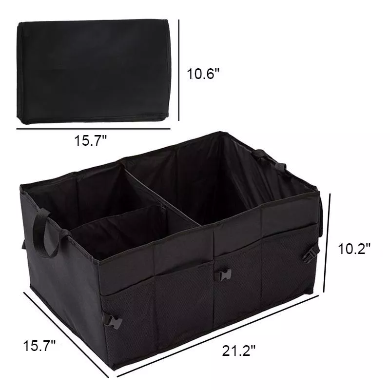 Discover the perfect solution to a cluttered vehicle with our Universal Collapsible Car Trunk Organizer. Made from high-quality Oxford material, this durable and waterproof storage box is your go-to companion for keeping your car tidy and organized. Its versatile design, featuring three spacious compartments, two pouches with magic lids, and multiple mesh pouches, offers immense storage capacity to accommodate all your essentials, from repair tools to snacks and water bottles.